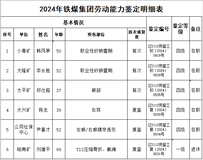 經(jīng)鐵嶺市人力資源和社會保障局勞動能力鑒定委員會于2024年12月15日進(jìn)行工傷職工勞動能力鑒定,現(xiàn)將鑒定結(jié)論予以發(fā)布公示。鑒定為1-4級人員6人。其中:在職5人,退休1人。現(xiàn)將有關(guān)信息公示如下,請廣大員工及家屬認(rèn)真監(jiān)督,如發(fā)現(xiàn)傷情與實(shí)際不符的,請于2025年1月23日前向鐵嶺市人力資源和社會保障局勞動能力鑒定委員會、鐵煤集團(tuán)公司社會保險管理中心予以舉報。公示期:2025年1月17日至1月23日。