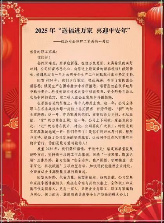 為進(jìn)一步夯實(shí)企業(yè)安全文化根基,提升職工安全素養(yǎng),充分調(diào)動職工家屬參與安全管理的積極性、主動性和創(chuàng)造性,凝聚“企業(yè)抓安全、家庭助安全、職工保安全”的強(qiáng)大合力,為公司持續(xù)安全穩(wěn)定發(fā)展提供有力支撐,在2025年新春佳節(jié)即將來臨之際,公司工會開展了2025年“送福進(jìn)萬家 喜迎平安年”——致職工家屬一封信活動。