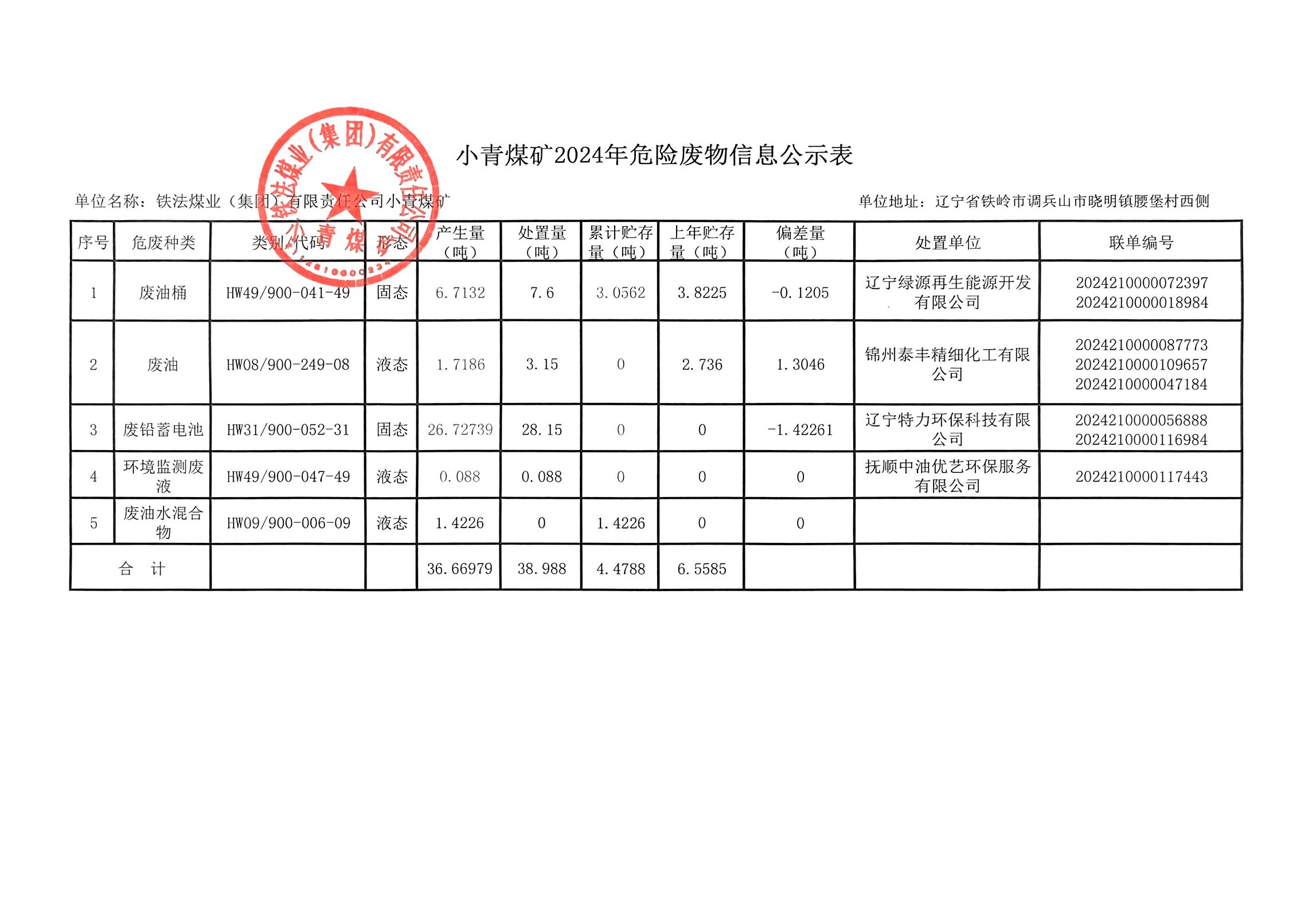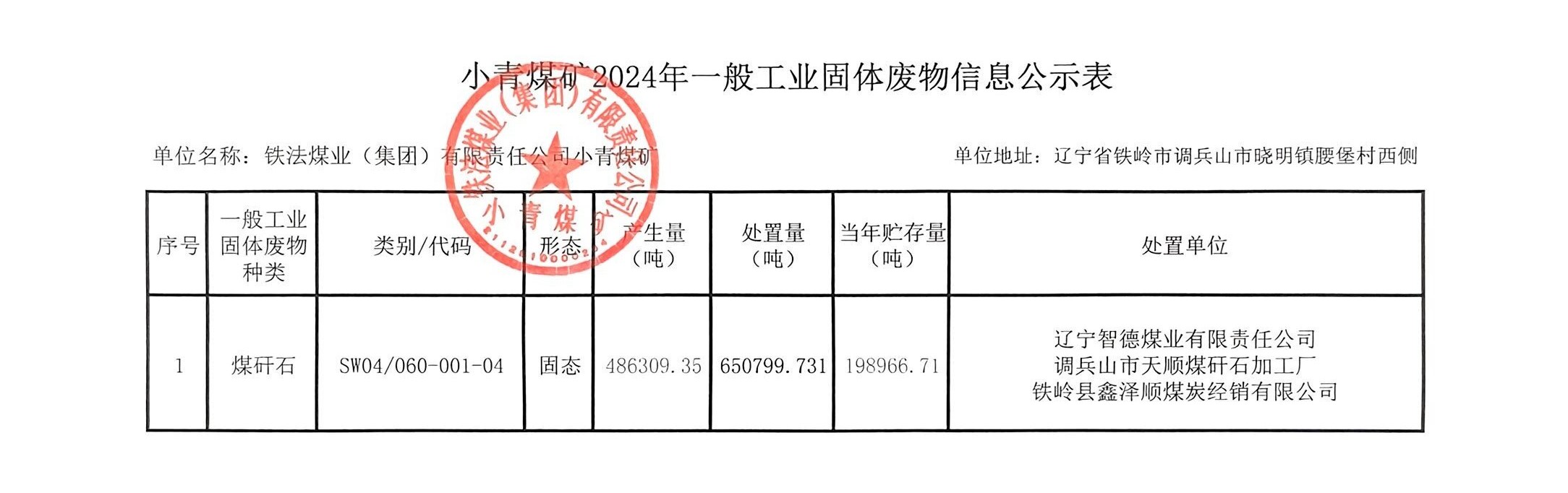 小青礦2024年度固體廢物污染環(huán)境防治信息