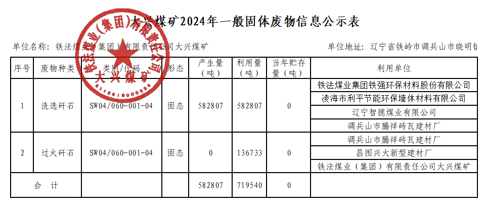 大興礦2024年度固體廢物污染環(huán)境防治信息