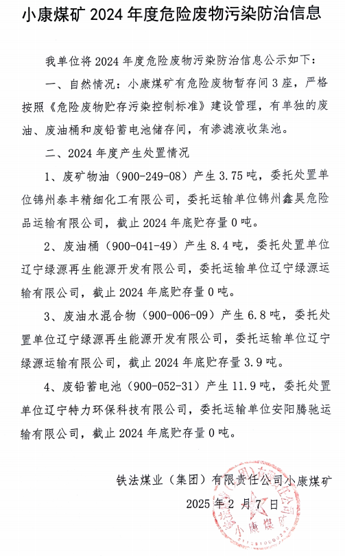 小康礦2024年度固體廢物污染環(huán)境防治信息