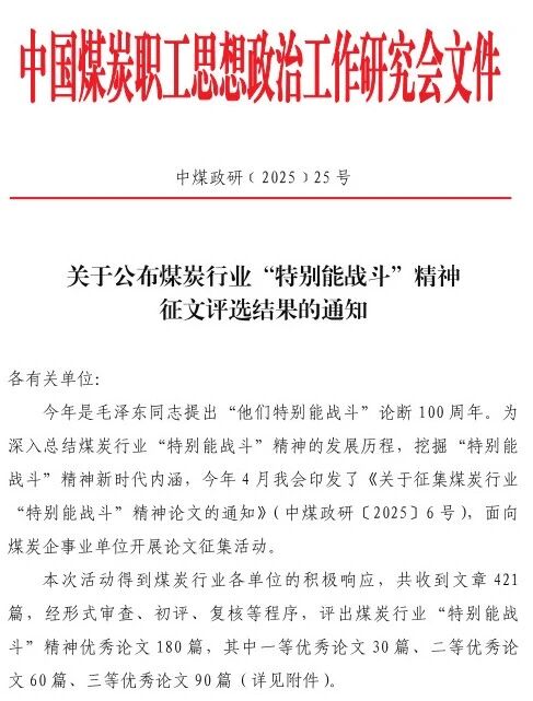 據(jù)了解,本次評(píng)選活動(dòng)共收到論文421篇,最后評(píng)出煤炭行業(yè)“特別能戰(zhàn)斗”精神優(yōu)秀論文180篇。