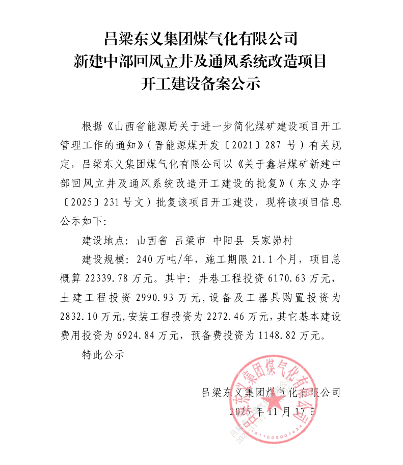 呂梁東義集團(tuán)煤氣化有限公司新建中部回風(fēng)立井及通風(fēng)系統(tǒng)改造項(xiàng)目開工建設(shè)備案公示