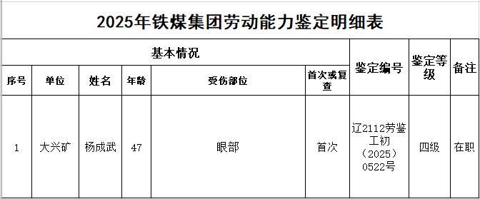 經(jīng)鐵嶺市人力資源和社會保障局勞動能力鑒定委員會于2025年12月5日進行工傷職工勞動能力鑒定,現(xiàn)將鑒定結(jié)論予以發(fā)布公示。鑒定為1-4級人員1人,為在職職工。現(xiàn)將有關(guān)信息公示如下,請廣大員工及家屬認(rèn)真監(jiān)督,如發(fā)現(xiàn)傷情與實際不符的,請于2026年1月18日前向鐵嶺市人力資源和社會保障局勞動能力鑒定委員會、鐵煤集團公司社會保險管理中心予以舉報。公示期:2026年1月12日至1月18日。