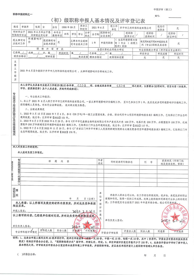 開平市幾何環(huán)??萍加邢薰炯夹g(shù)人員申報職稱評前公示